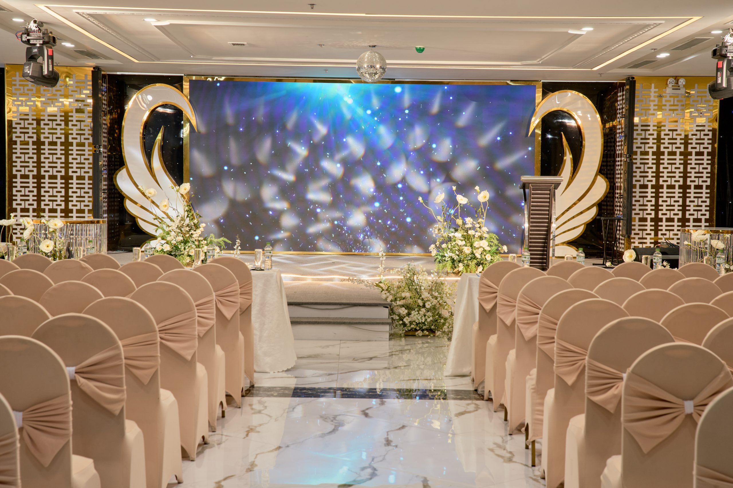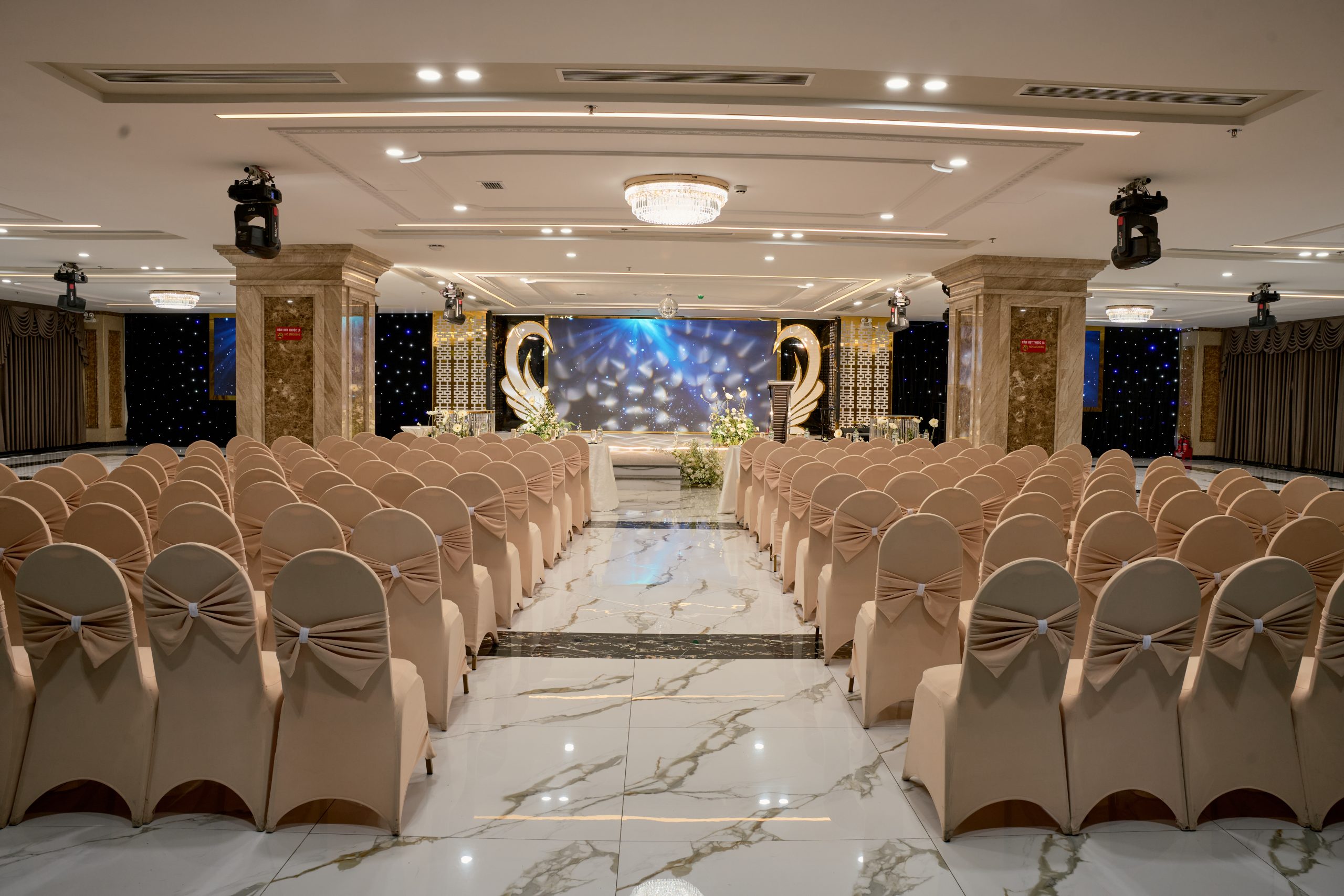 Thiết kế tinh tế và sang trọng, kết hợp hài hòa giữa kiến trúc hiện đại và âm hưởng truyền thống. Không gian rộng rãi nhưng vẫn ấm cúng, nổi bật với tông màu vàng ánh kim – biểu tượng hạnh phúc và viên mãn. Hệ thống sân khấu, âm thanh, ánh sáng, màn hình LED hiện đại mang đến trải nghiệm trọn vẹn cho mọi nghi lễ và khoảnh khắc đáng nhớ.