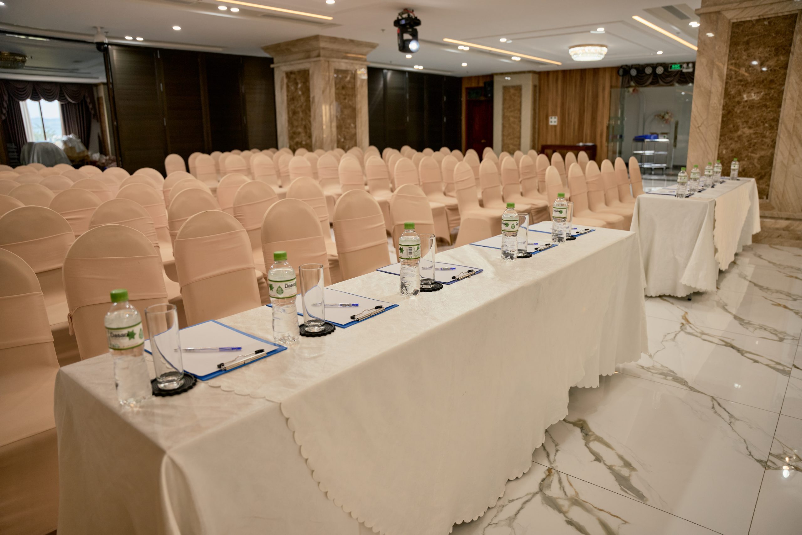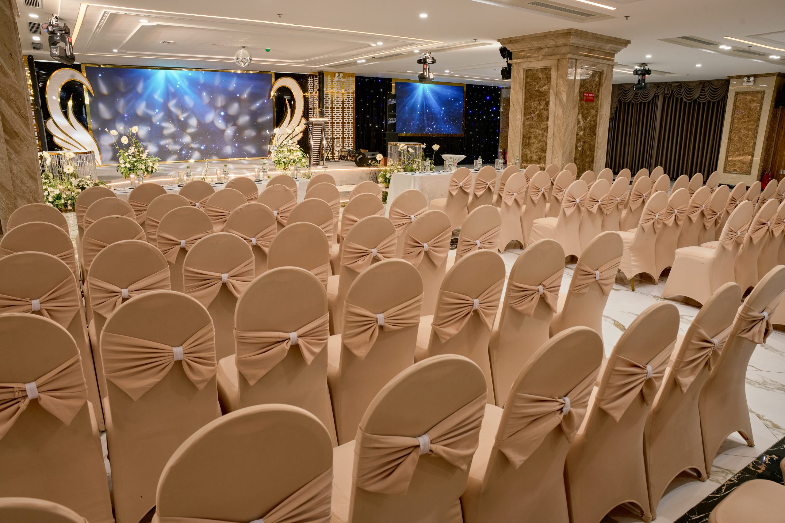 Không gian trang trọng, hiện đại và tinh tế, trang bị hệ thống âm thanh, ánh sáng, màn hình LED đạt chuẩn. Điểm nổi bật là cửa – vách ngăn di động linh hoạt, cho phép biến đổi theo nhu cầu: từ hội nghị, tiệc cưới, tiệc sinh nhật đến ra mắt sản phẩm. Sức chứa linh hoạt, phục vụ tốt các sự kiện từ vừa đến lớn.